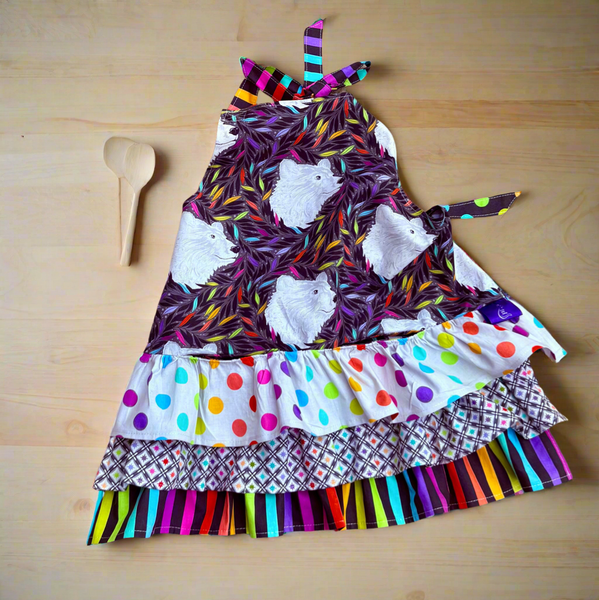 Tula Pink Graywork Fabric kit includes 1.75 m fabric for apron as shown with ruffles and ties and a copy of the printed pattern.