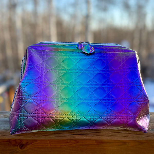 Large Retreat Bag KIT includes precut vinyl for outside, lining, EBfuse Light and Thermolam for the lining of the bag, 24” rainbow zipper and two zipper pulls, two metal rainbow zipper ends and one set of large metal frames. The kit includes a copy of the printed pattern which is a free pattern by Emmaline Bags.