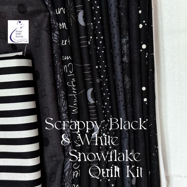 Kit includes 13 assorted black FQ for scrappy background and white for the snowflake. Striped binding and a copy of the pattern